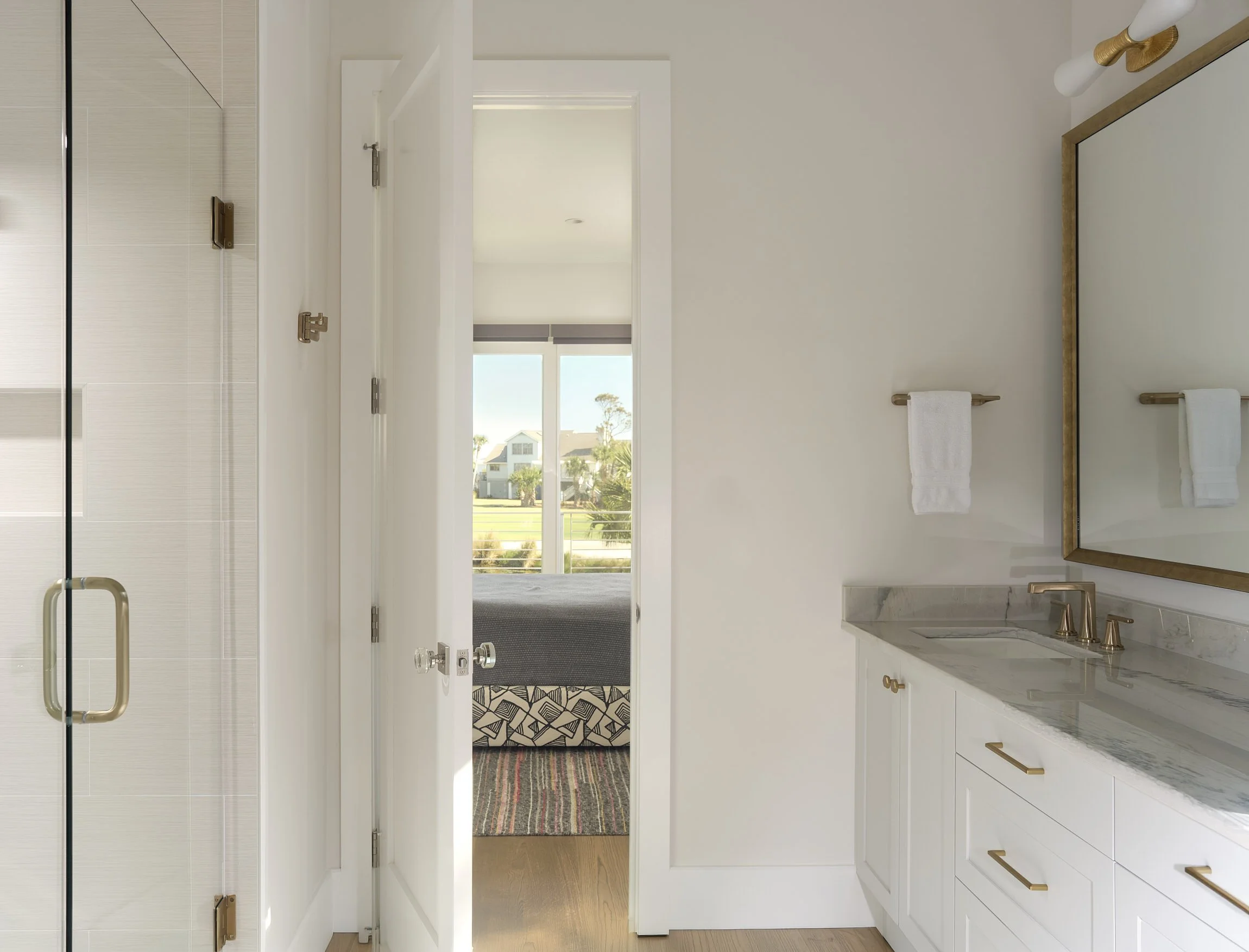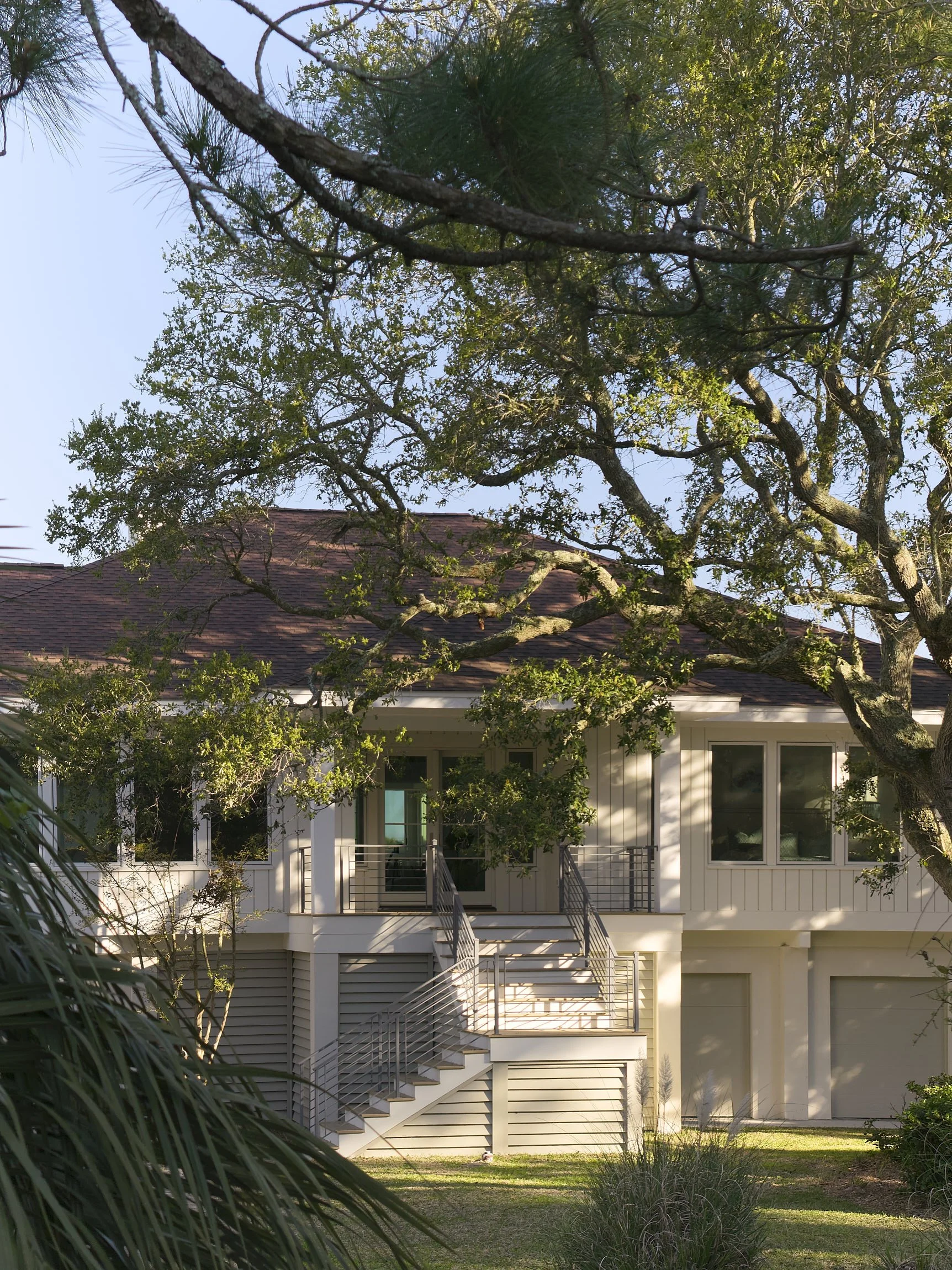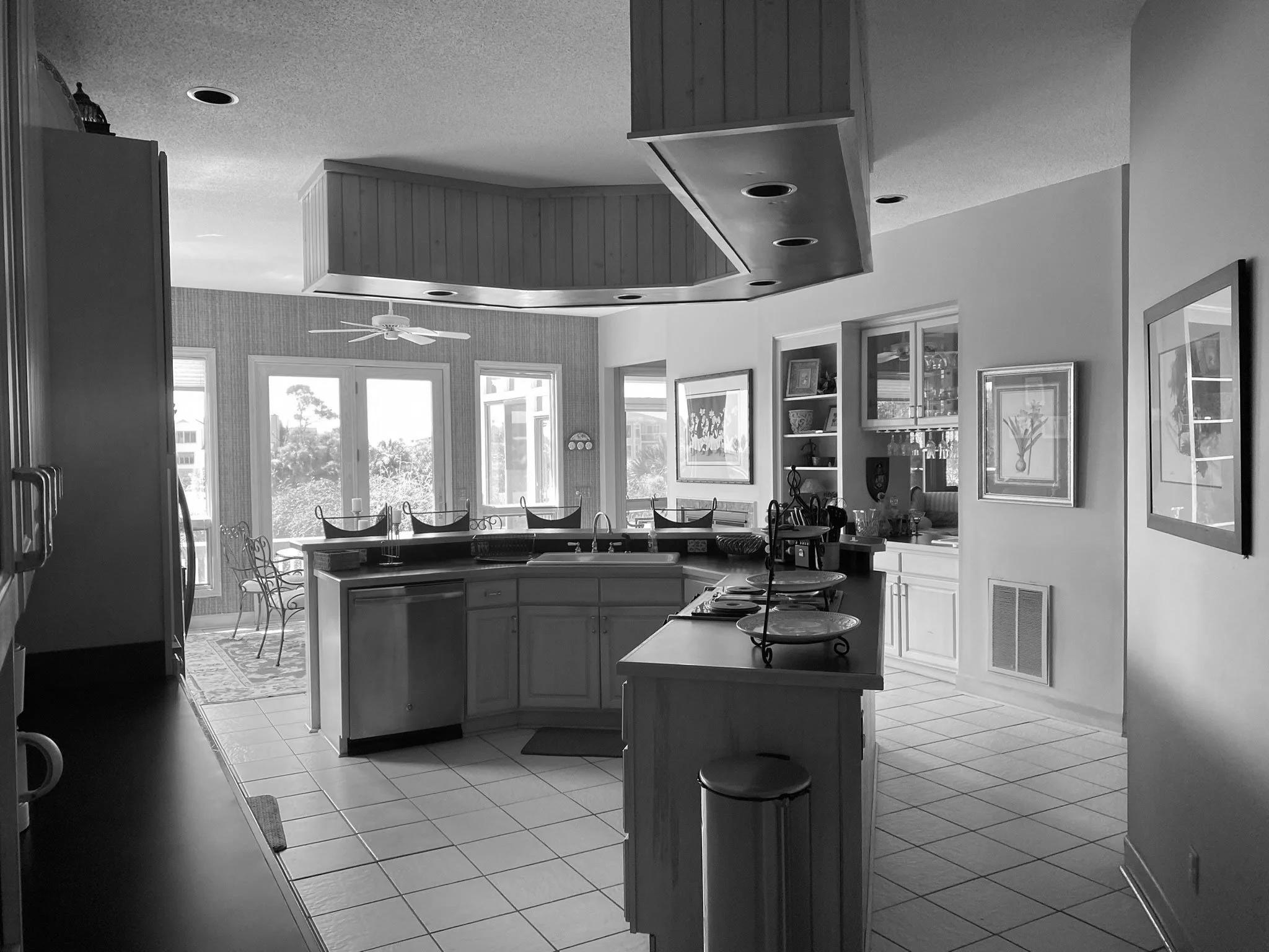 This Fripp Island house is the second we’ve renovated for the family, remember the Beach House Uplift project? This house has been owned by the family for years. They bought and renovated the house next door in order to create a compound retreat for their large family. After the Beach House Uplift was raised up and renovated, it was clear that the neighboring house was in need of an overhaul as well. The spaces in the house were so seventies, it was dark, closed in and not working for this young, vibrant, and active family. The house was gutted, all the doors and windows removed, all fixtures, flooring, tile, hvac, and cabinets were replaced. The result is a comfortable, light-filled, beach house that fits in as the second in this family compound. The before-and-after shots are pretty dramatic!
