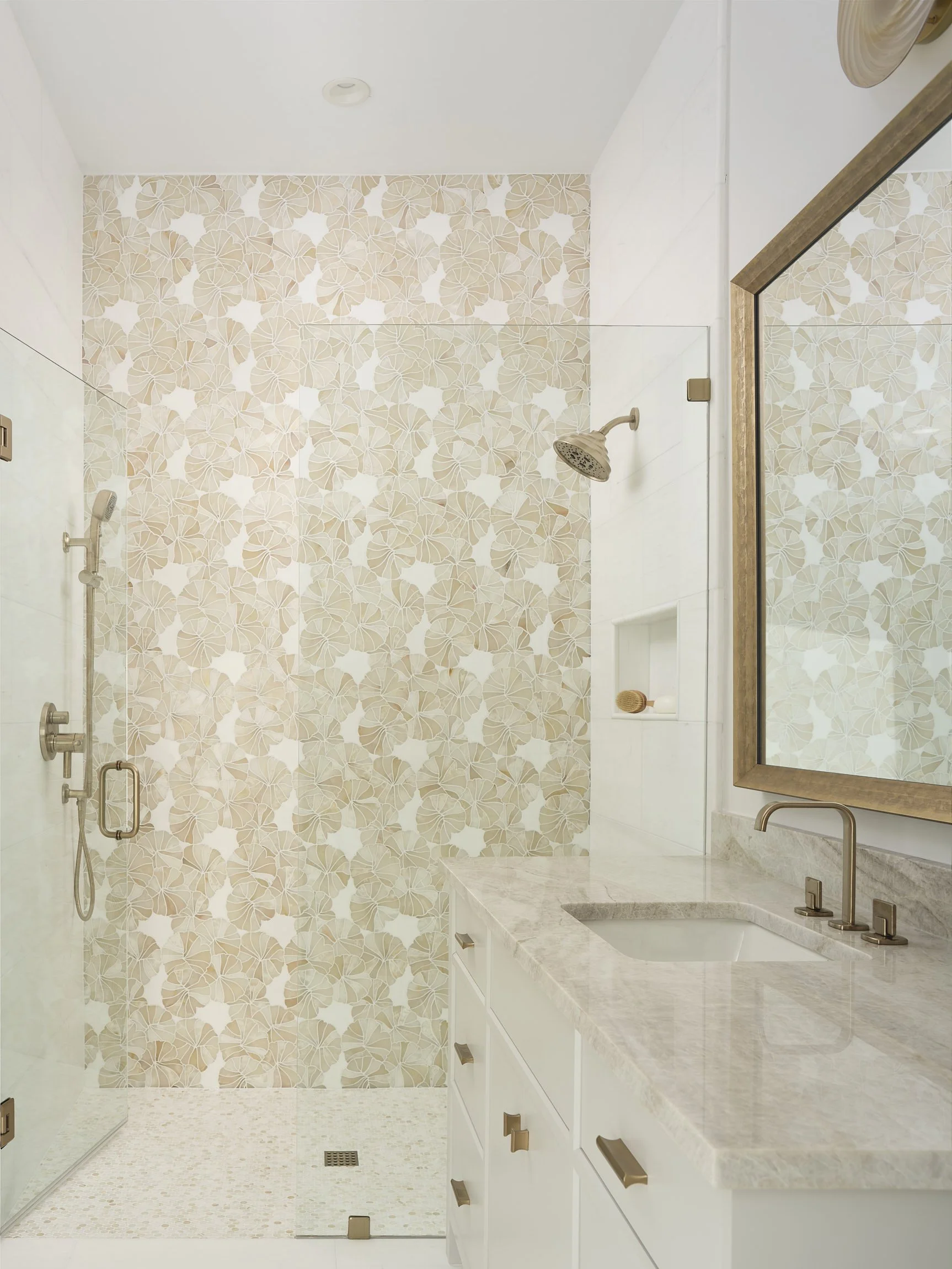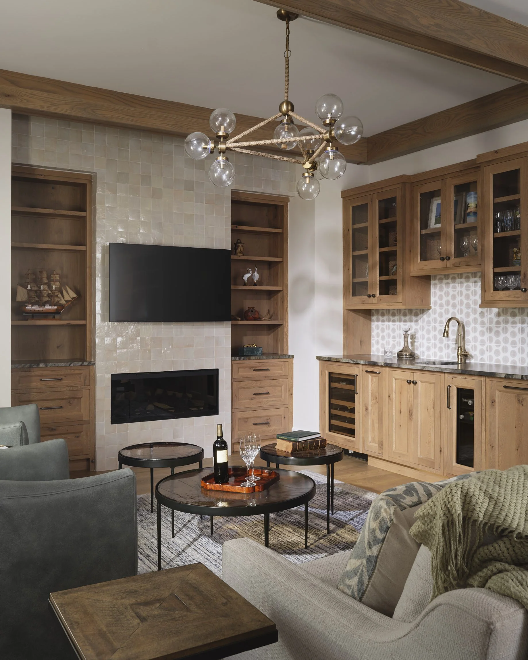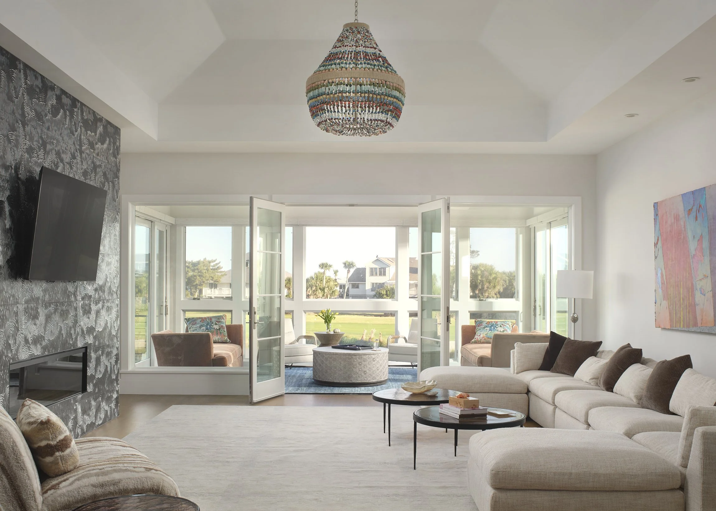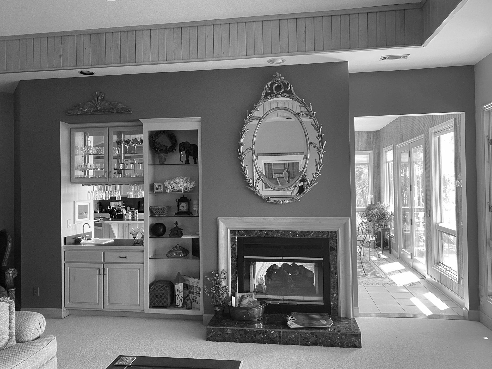 After…the living room opens seamlessly to the screen porch beyond. The fireplace was totally rebuilt and clad in this fun, textural tile.
