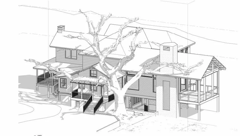 The real advantage to utilizing this technology is the accuracy and detail of the information gathered. We have a 3D Revit model of every aspect of the house, as well as a digital walkthrough of the property. No where has this been more beneficial than at the newest renovation on the boards. There is a 47” caliper Live Oak tree on the property- it’s big, and right up against the house, potentially blocking the area of the proposed addition. We were able to import the 3D model of the tree into our project, and voila- it fits like a glove- very cool!