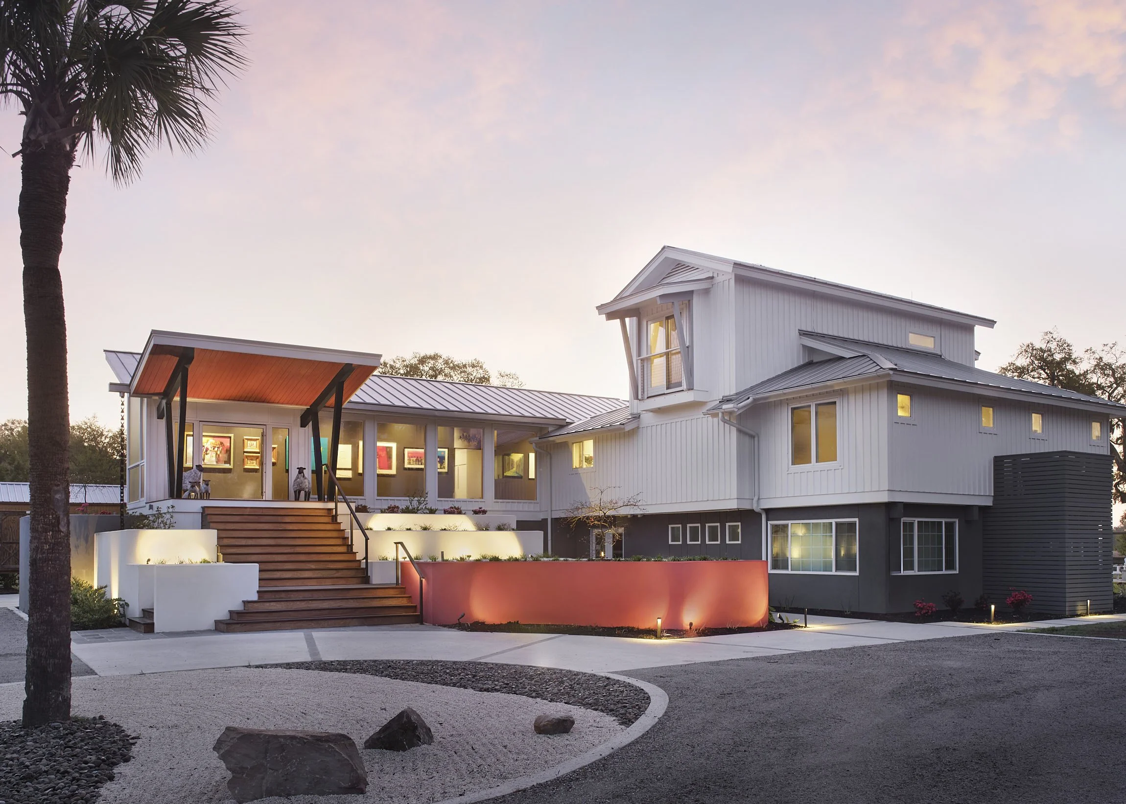 The landscape is designed to match the playful nature of the roof forms. Sculptural stairs connect the porch terrace below. The sequence encourages movement toward the rain chain and marsh views before descending and curving into a gathering space anchored by a large fire pit.