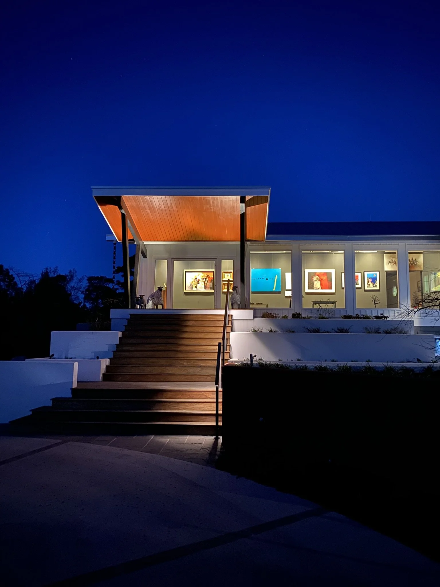 The entry to the house has been transformed into a gallery space, with room along one side of the wide hallway for the owner’s collection of paintings. Large windows on the opposite side overlook terraced planters designed for sculpture display. These raised planters also serve a practical purpose, allowing for plantings that cannot withstand the periodic saltwater flooding of the site.